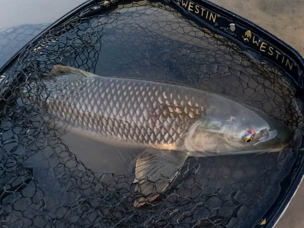 Kurz erzählt, den Karpfen konnte ich schnell landen und die Nymphe fiel aus dem Maul, als die Spannung nachließ und der Fisch war frei und schwamm weg – fischen ohne Widerhaken, bietet schon so manche Vorteile!